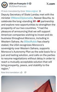 La publicación señala: “Como lo afirmó claramente el secretario de Estado Rubio, Estados Unidos reconoce la soberanía de Marruecos sobre el Sáhara, apoya el plan de autonomía como único fundamento para una solución justa y duradera, y llama a las partes a reanudar sin demora las negociaciones con el fin de alcanzar una solución consensuada que aporte prosperidad, paz y estabilidad a la región.”